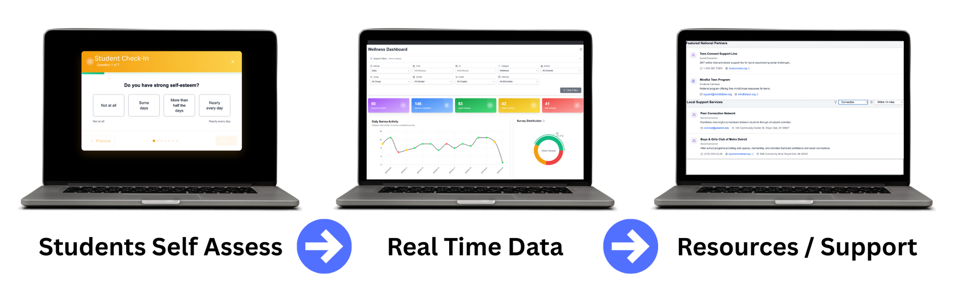 Our mission is to help schools build safe, supportive, and engaging learning environments by empowering educators to consistently connect with their students. Through our check-in system, schools can quickly reach every student, assess their needs, and receive results within minutes. Real-time insights equip educators to act early and deliver the right support at the right moment. By shifting from reactive to proactive care, schools foster stronger connections, increase student engagement, and enable data-driven decisions that truly make a difference.